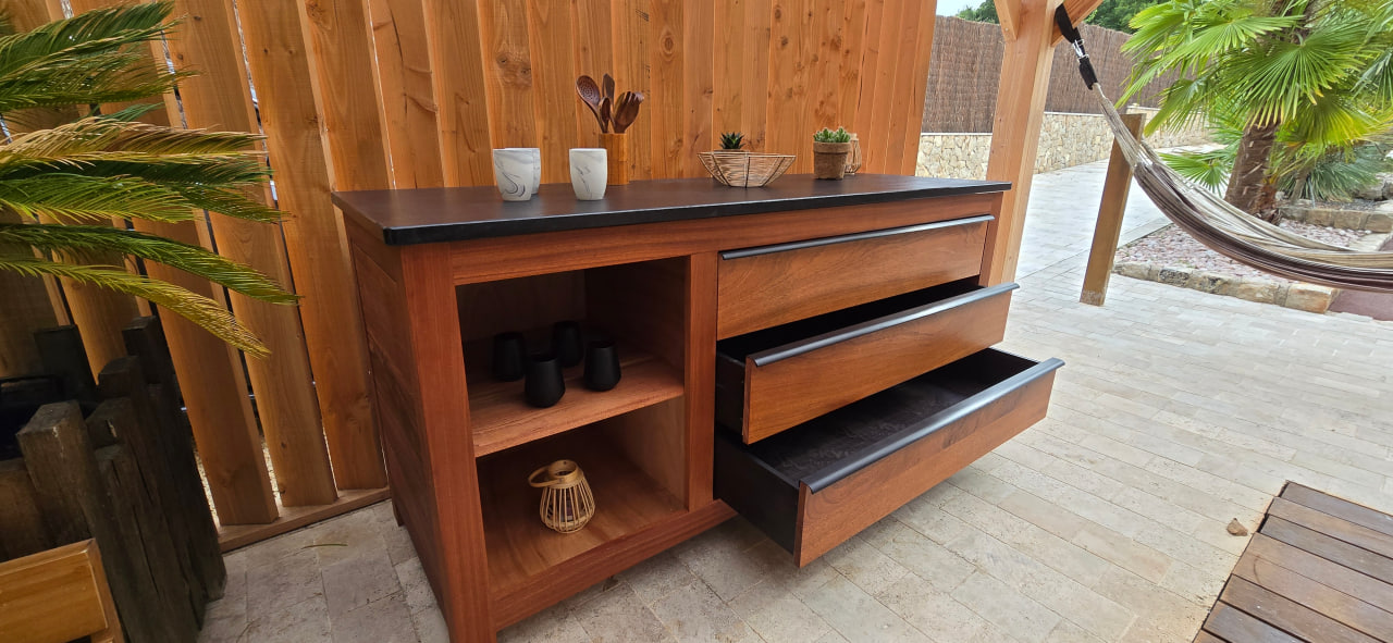 Nous avons commandé une cuisine d’été en bois exotique avec plan de travail en granit. La qualité des finitions est remarquable et l’ensemble s’intègre parfaitement à notre terrasse. Produit solide et très bien conçu.