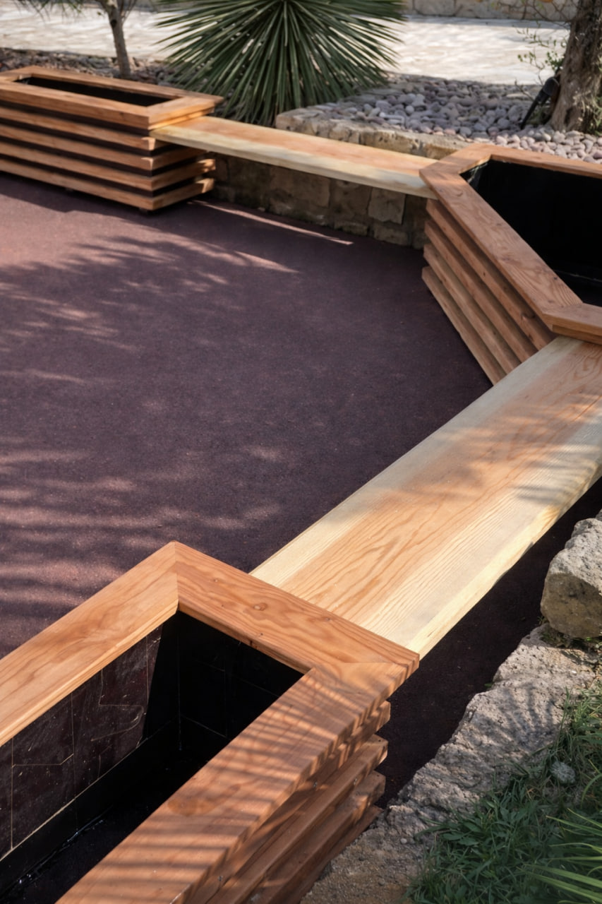 Banc en bois Douglas conçu pour relier les modules de jardinières et créer des espaces de détente.